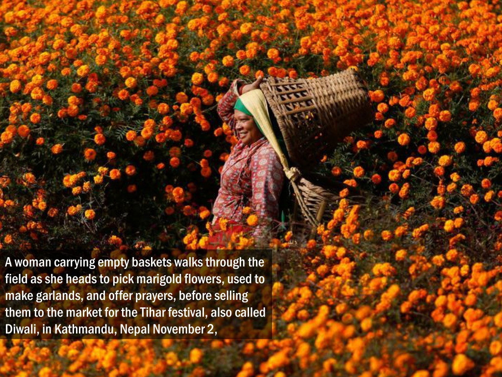 A woman fills her basket with freshly picked marigold flowers, used to make garlands, and offer prayers, before selling them to the market for the Tihar festival, also called Diwali, in Kathmandu, Nepal November 2, 2021. REUTERS/Navesh Chitrakar