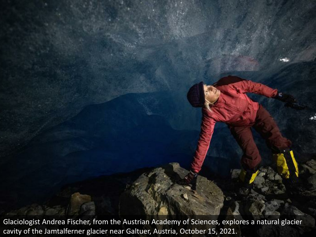 Glaciologist Andrea Fischer, from the Austrian Academy of Sciences, explores a natural glacier cavity of the Jamtalferner glacier near Galtuer, Austria, October 15, 2021.