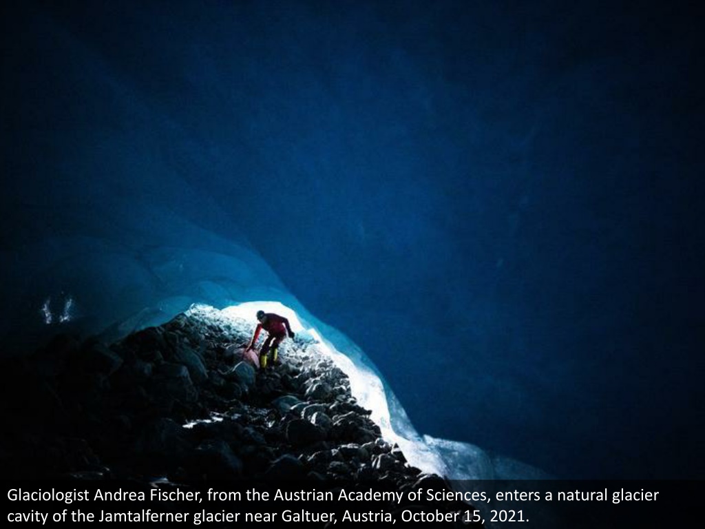 Glaciologist Andrea Fischer, from the Austrian Academy of Sciences, enters a natural glacier cavity of the Jamtalferner glacier near Galtuer, Austria, October 15, 2021.