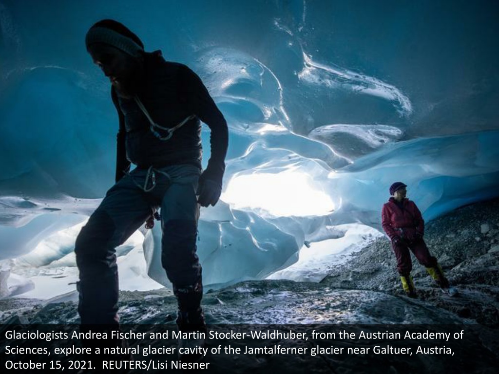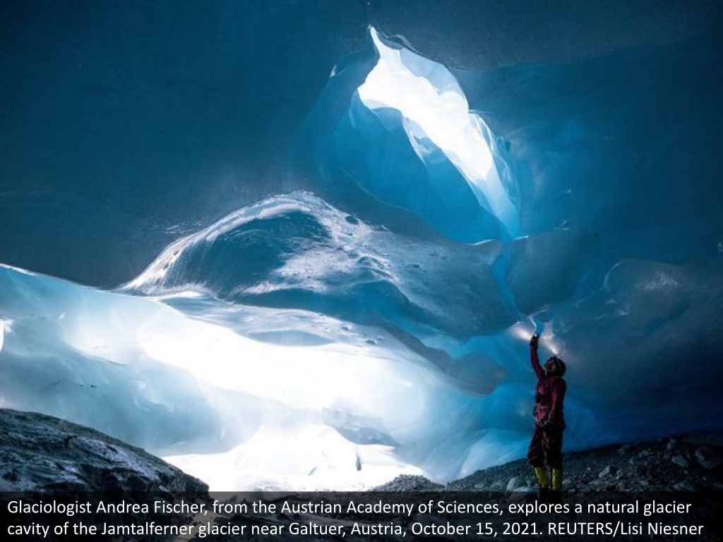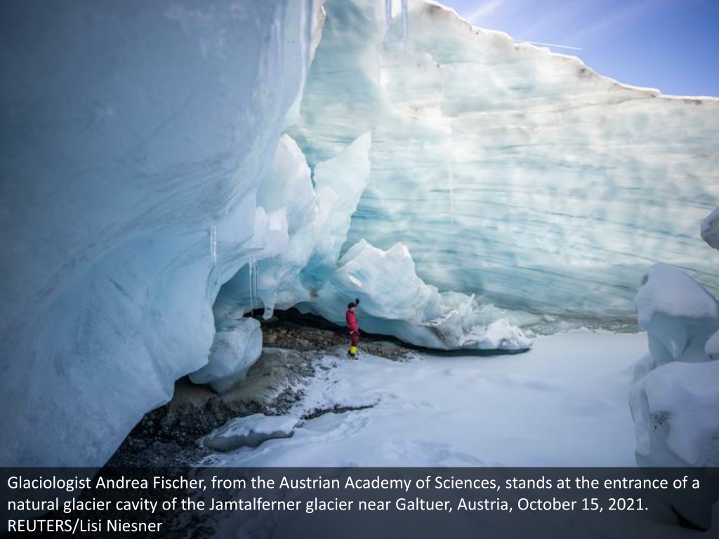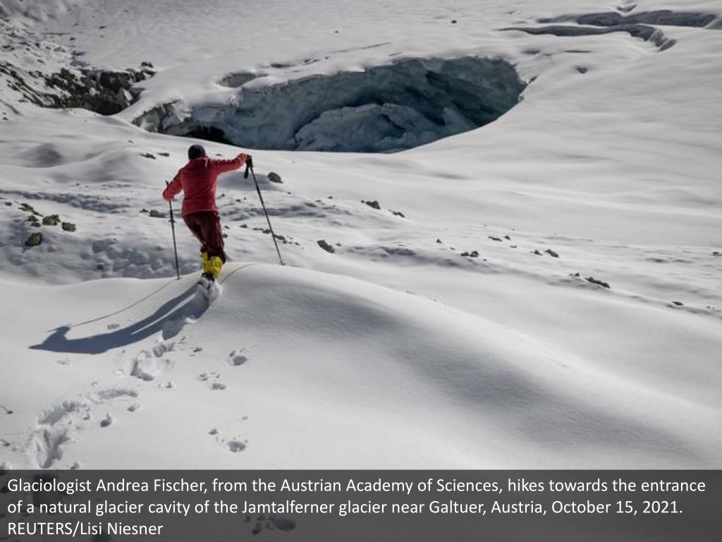 Glaciologist Andrea Fischer, from the Austrian Academy of Sciences, explores a natural glacier cavity of the Jamtalferner glacier near Galtuer, Austria, October 15, 2021. REUTERS/Lisi Niesner