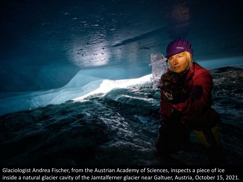 Glaciologist Andrea Fischer, from the Austrian Academy of Sciences, inspects a piece of ice inside a natural glacier cavity of the Jamtalferner glacier near Galtuer, Austria, October 15, 2021.