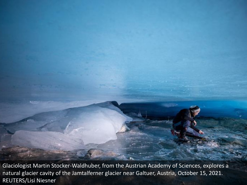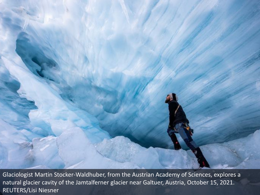 Glaciologist Martin Stocker-Waldhuber, from the Austrian Academy of Sciences, explores a natural glacier cavity of the Jamtalferner glacier near Galtuer, Austria, October 15, 2021. REUTERS/Lisi Niesner