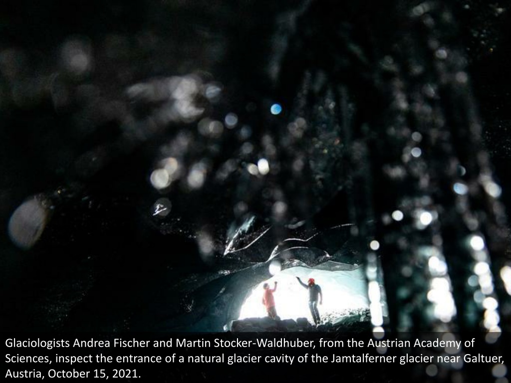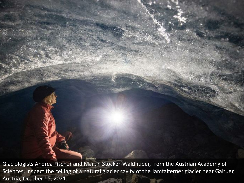 Glaciologists Andrea Fischer and Martin Stocker-Waldhuber, from the Austrian Academy of Sciences, inspect the ceiling of a natural glacier cavity of the Jamtalferner glacier near Galtuer, Austria, October 15, 2021.