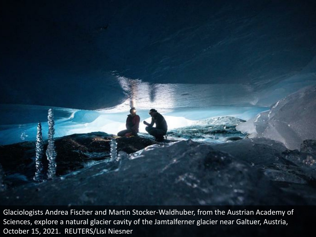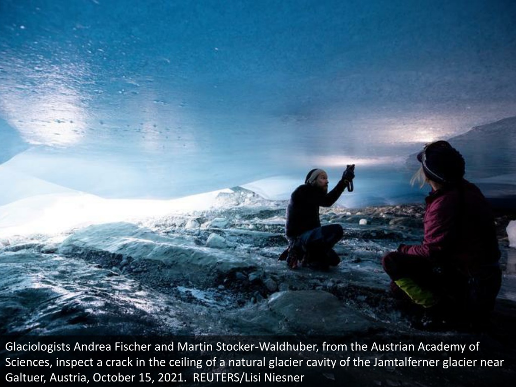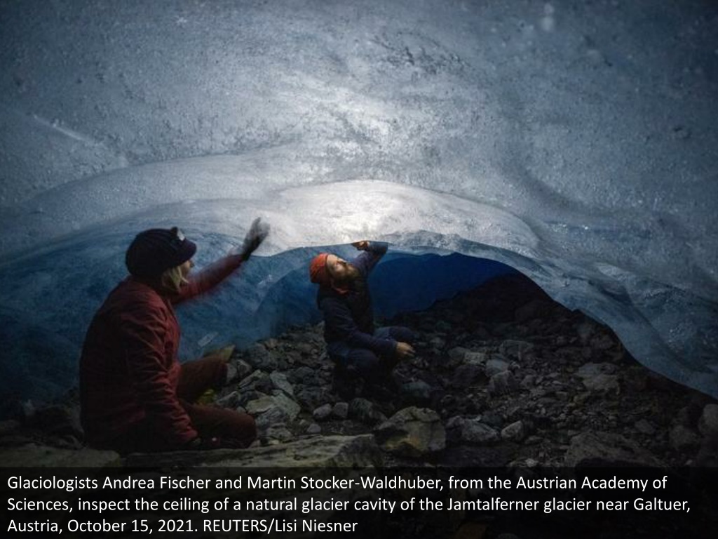 Glaciologists Andrea Fischer and Martin Stocker-Waldhuber, from the Austrian Academy of Sciences, inspect a crack in the ceiling of a natural glacier cavity of the Jamtalferner glacier near Galtuer, Austria, October 15, 2021. REUTERS/Lisi Niesner
