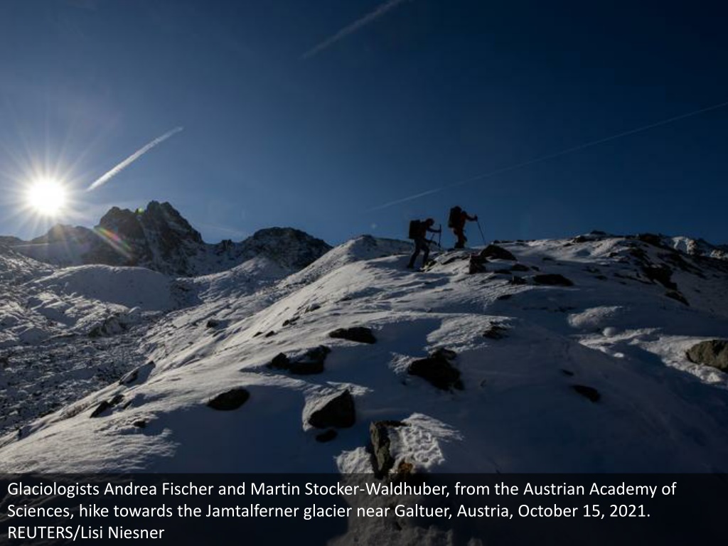 Glaciologists Andrea Fischer and Martin Stocker-Waldhuber, from the Austrian Academy of Sciences, hike towards the Jamtalferner glacier near Galtuer, Austria, October 15, 2021. REUTERS/Lisi Niesner