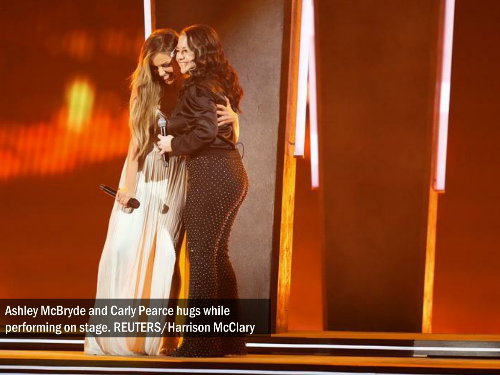 Ashley McBryde and Carly Pearce hugs while performing on stage. REUTERS/Harrison McClary