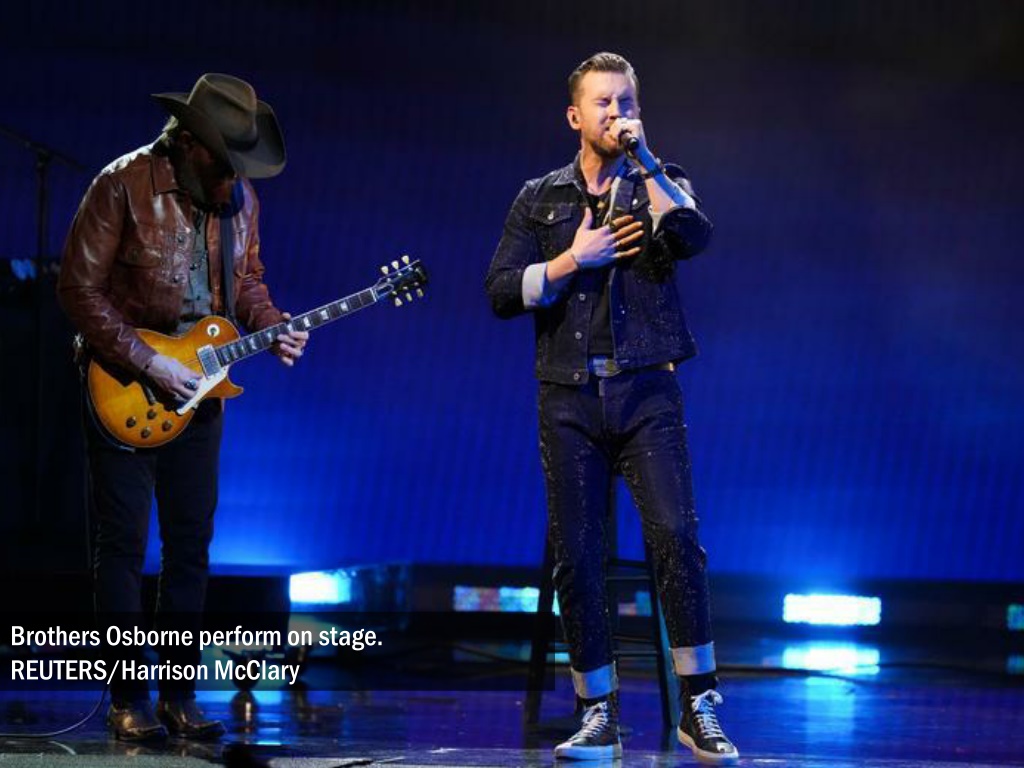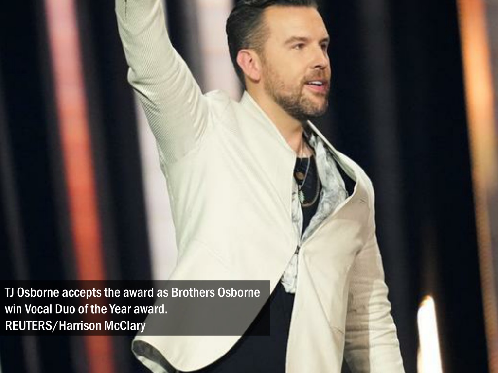 TJ Osborne accepts the award as Brothers Osborne win Vocal Duo of the Year award. REUTERS/Harrison McClary