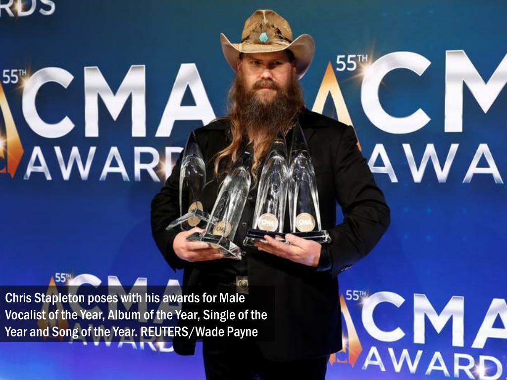 Chris Stapleton poses with his awards for Male Vocalist of the Year, Album of the Year, Single of the Year and Song of the Year. REUTERS/Wade Payne