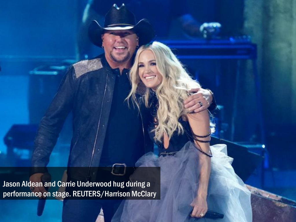 Jason Aldean and Carrie Underwood hug during a performance on stage. REUTERS/Harrison McClary