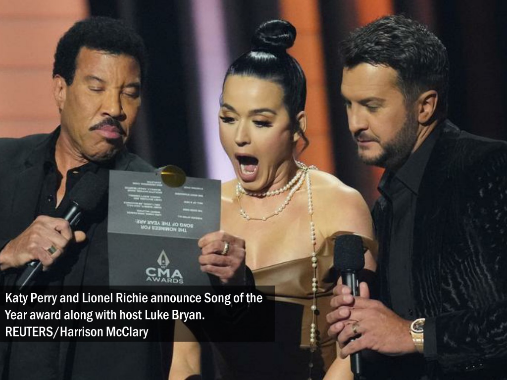 Katy Perry and Lionel Richie announce Song of the Year award along with host Luke Bryan. REUTERS/Harrison McClary