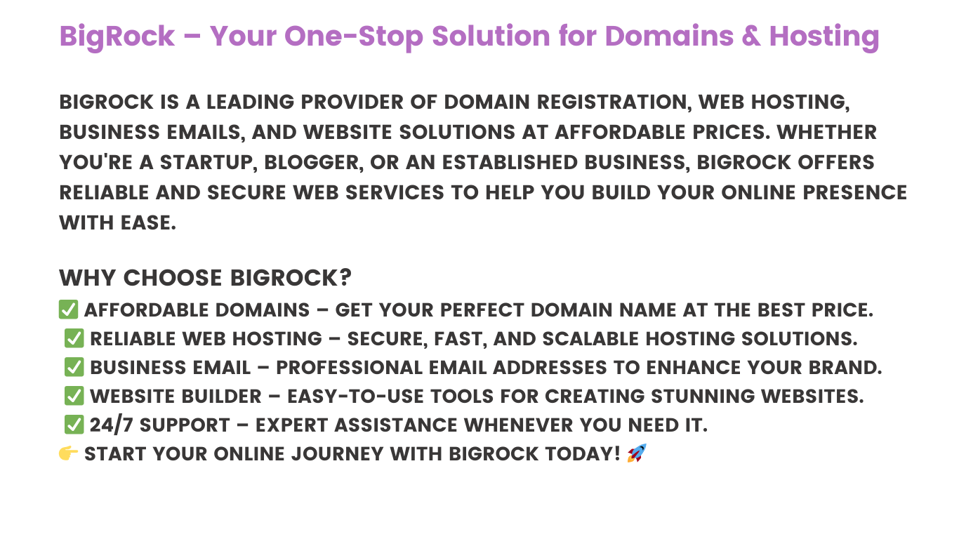 2️⃣ Fast and Secure Web Hosting Website speed and security are crucial. BigRock provides various hosting solutions, including Shared Hosting, VPS Hosting, WordPress Hosting, and Dedicated Servers to suit your needs.