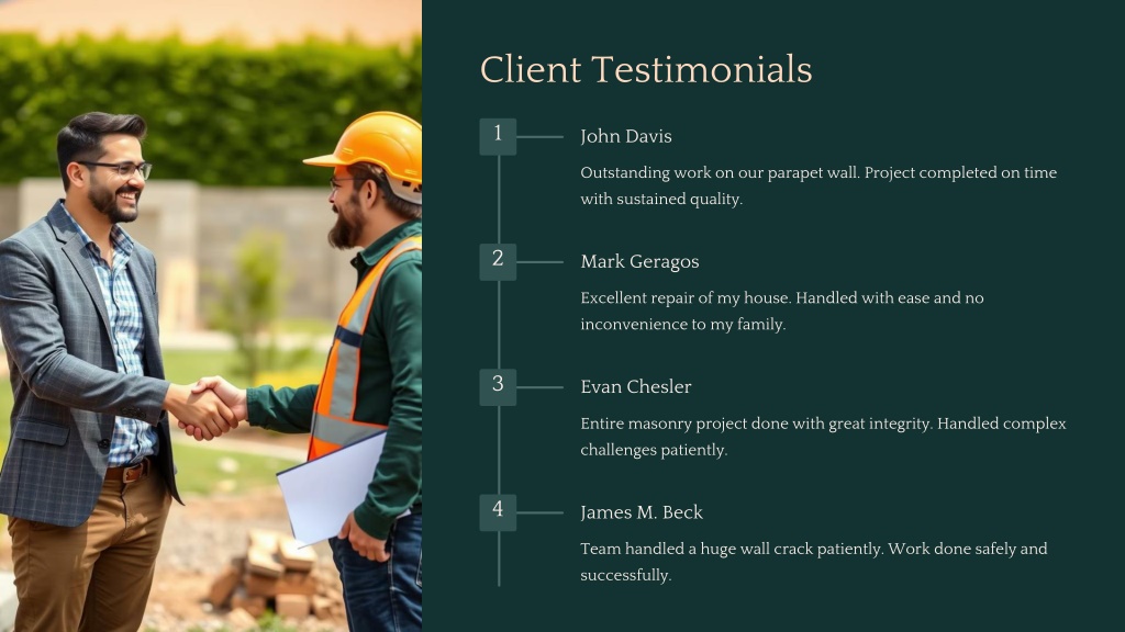 Client Testimonials 1 John Davis Outstanding work on our parapet wall. Project completed on time with sustained quality. 2 Mark Geragos Excellent repair of my house. Handled with ease and no inconvenience to my family. 3 Evan Chesler Entire masonry project done with great integrity. Handled complex challenges patiently. 4 James M. Beck Team handled a huge wall crack patiently. Work done safely and successfully.