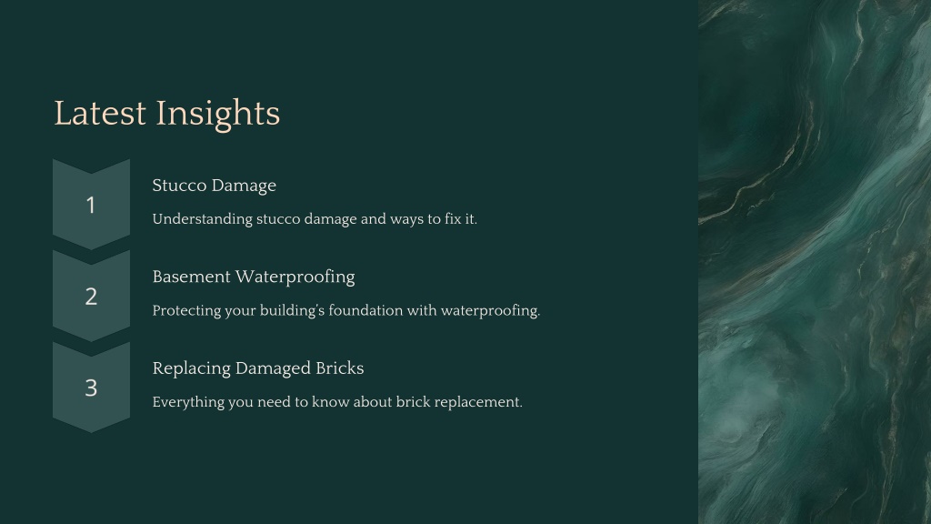 Latest Insights Stucco Damage Understanding stucco damage and ways to fix it. Basement Waterproofing Protecting your building’s foundation with waterproofing. Replacing Damaged Bricks Everything you need to know about brick replacement.