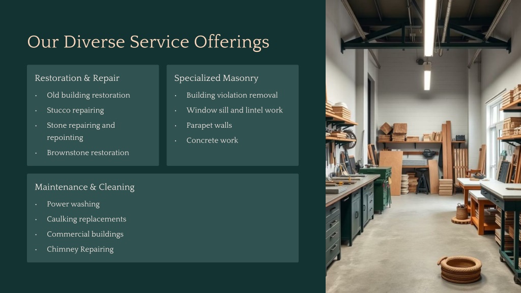 Our Diverse Service Offerings Restoration & Repair Specialized Masonry • Old building restoration • Building violation removal • Stucco repairing • Window sill and lintel work • Stone repairing and repointing • Parapet walls • Concrete work • Brownstone restoration Maintenance & Cleaning • Power washing • Caulking replacements • Commercial buildings • Chimney Repairing