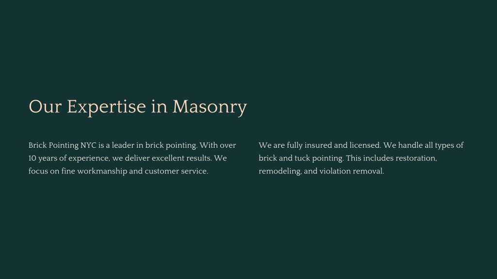 Brick Pointing NYC We are a well-established brick pointing company with over two decades of invaluable experience. Our expertise extends to a comprehensive range of masonry services offered throughout NYC.