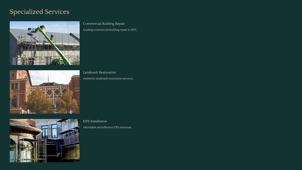 Specialized Services Commercial Building Repair Leading commercial building repair in NYC. Landmark Restoration Authentic landmark restoration services. EIFS Installation Affordable and effective EIFS solutions.