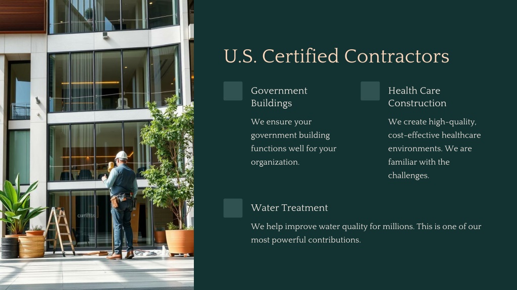 U.S. Certified Contractors Government Buildings Health Care Construction We ensure your government building functions well for your organization. We create high-quality, cost-effective healthcare environments. We are familiar with the challenges. Water Treatment We help improve water quality for millions. This is one of our most powerful contributions.