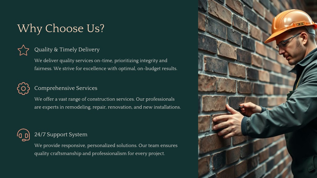 Why Choose Us? Quality & Timely Delivery We deliver quality services on-time, prioritizing integrity and fairness. We strive for excellence with optimal, on-budget results. Comprehensive Services We offer a vast range of construction services. Our professionals are experts in remodeling, repair, renovation, and new installations. 24/7 Support System We provide responsive, personalized solutions. Our team ensures quality craftsmanship and professionalism for every project.