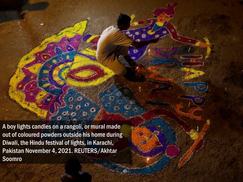 A boy lights candles on a rangoli, or mural made out of coloured powders outside his home during Diwali, the Hindu festival of lights, in Karachi, Pakistan November 4, 2021. REUTERS/Akhtar Soomro