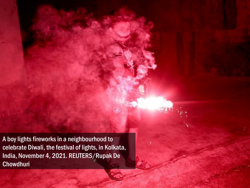 A boy lights fireworks in a neighbourhood to celebrate Diwali, the festival of lights, in Kolkata, India, November 4, 2021. REUTERS/Rupak De Chowdhuri