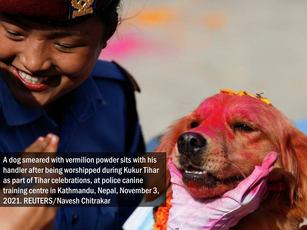 A dog smeared with vermilion powder sits with his handler after being worshipped during Kukur Tihar as part of Tihar celebrations, at police canine training centre in Kathmandu, Nepal, November 3, 2021. REUTERS/Navesh Chitrakar
