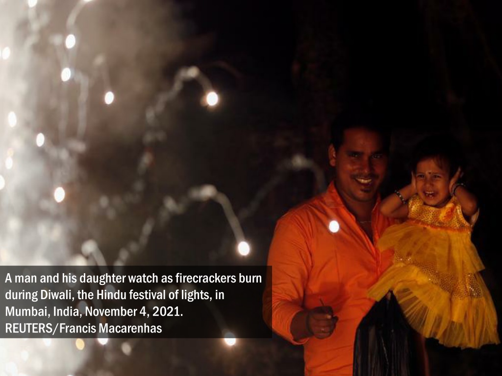 A man and his daughter watch as firecrackers burn during Diwali, the Hindu festival of lights, in Mumbai, India, November 4, 2021. REUTERS/Francis Macarenhas