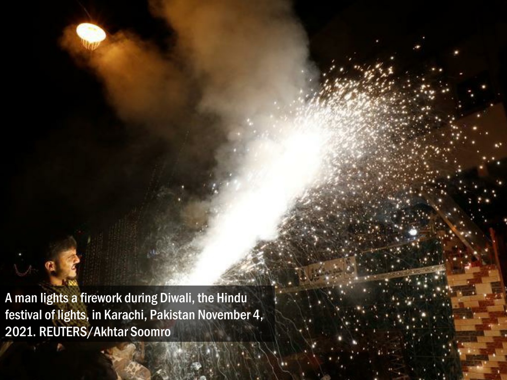 A man lights a firework during Diwali, the Hindu festival of lights, in Karachi, Pakistan November 4, 2021. REUTERS/Akhtar Soomro