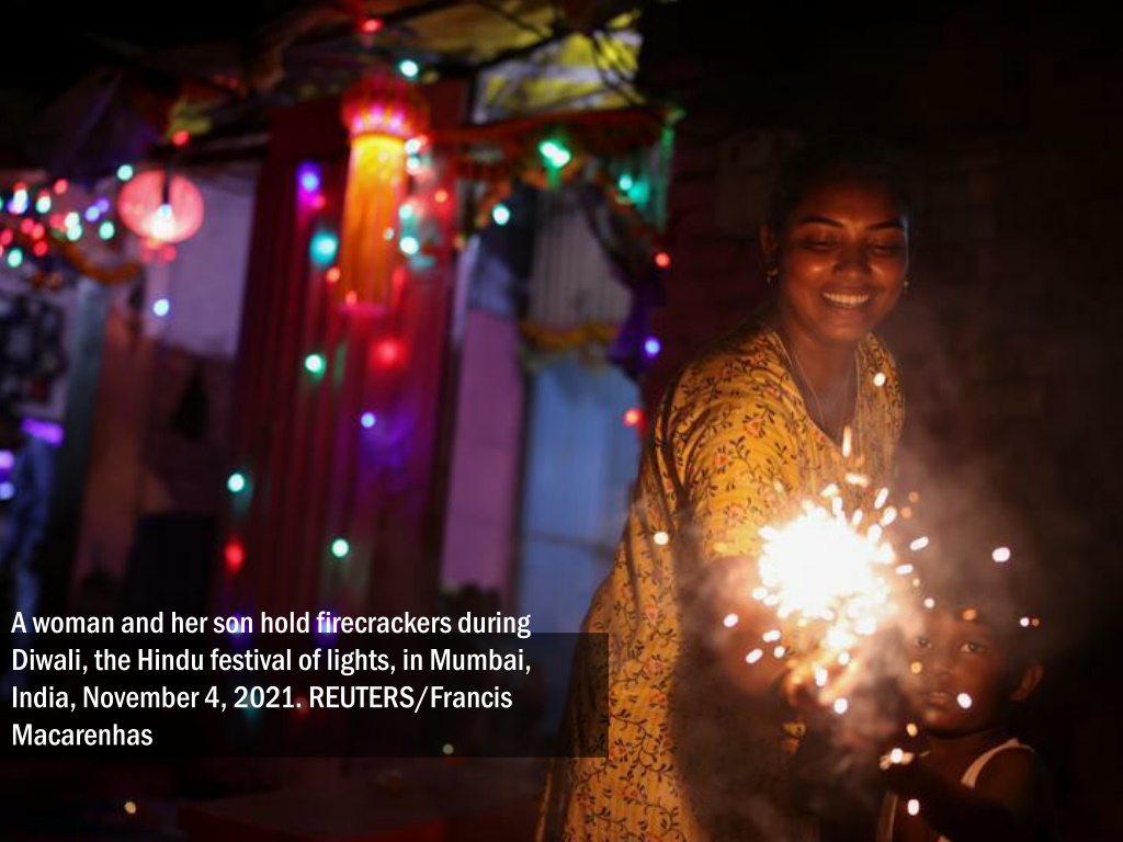 A woman and her son hold firecrackers during Diwali, the Hindu festival of lights, in Mumbai, India, November 4, 2021. REUTERS/Francis Macarenhas