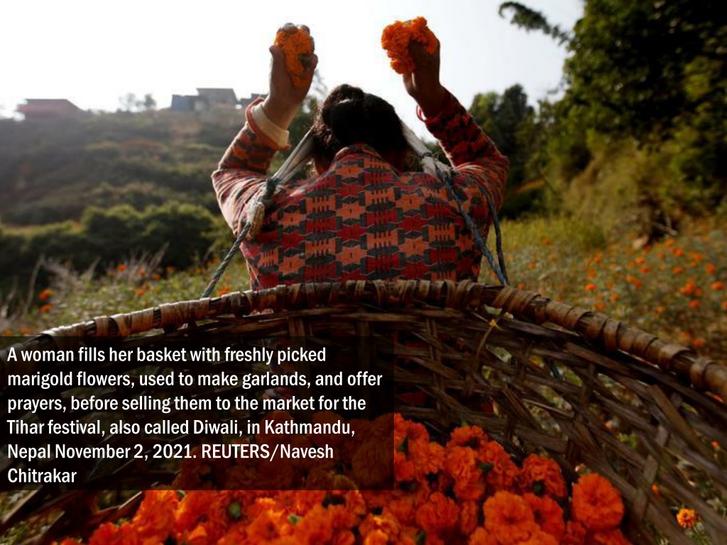 A woman fills her basket with freshly picked marigold flowers, used to make garlands, and offer prayers, before selling them to the market for the Tihar festival, also called Diwali, in Kathmandu, Nepal November 2, 2021. REUTERS/Navesh Chitrakar