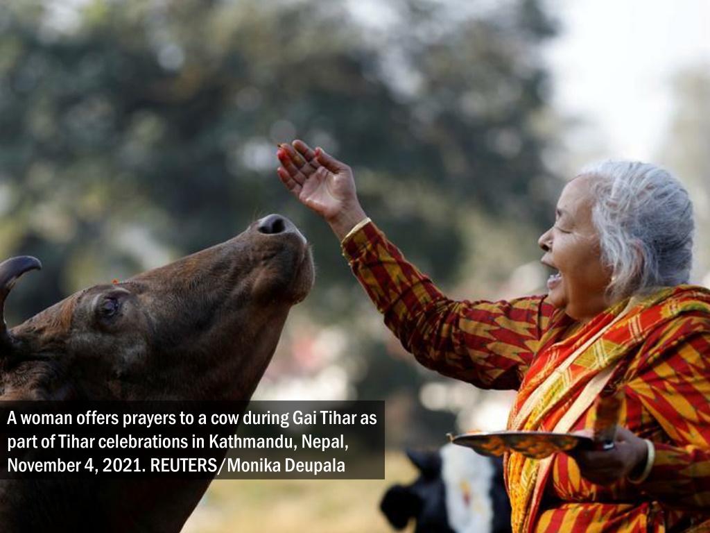 A woman offers prayers to a cow during Gai Tihar as part of Tihar celebrations in Kathmandu, Nepal, November 4, 2021. REUTERS/Monika Deupala