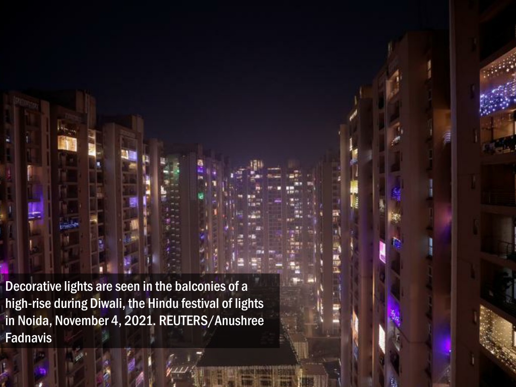 Decorative lights are seen in the balconies of a high-rise during Diwali, the Hindu festival of lights in Noida, November 4, 2021. REUTERS/Anushree Fadnavis