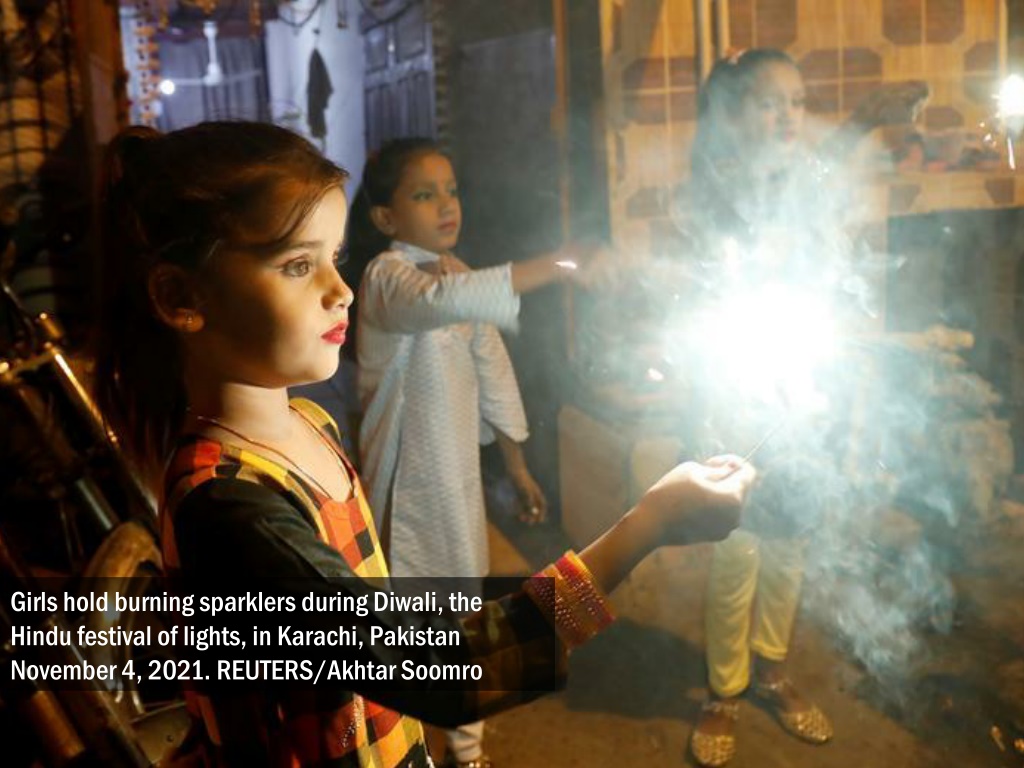 Girls hold burning sparklers during Diwali, the Hindu festival of lights, in Karachi, Pakistan November 4, 2021. REUTERS/Akhtar Soomro