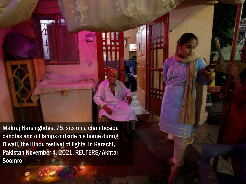 Mahraj Narsinghdas, 75, sits on a chair beside candles and oil lamps outside his home during Diwali, the Hindu festival of lights, in Karachi, Pakistan November 4, 2021. REUTERS/Akhtar Soomro