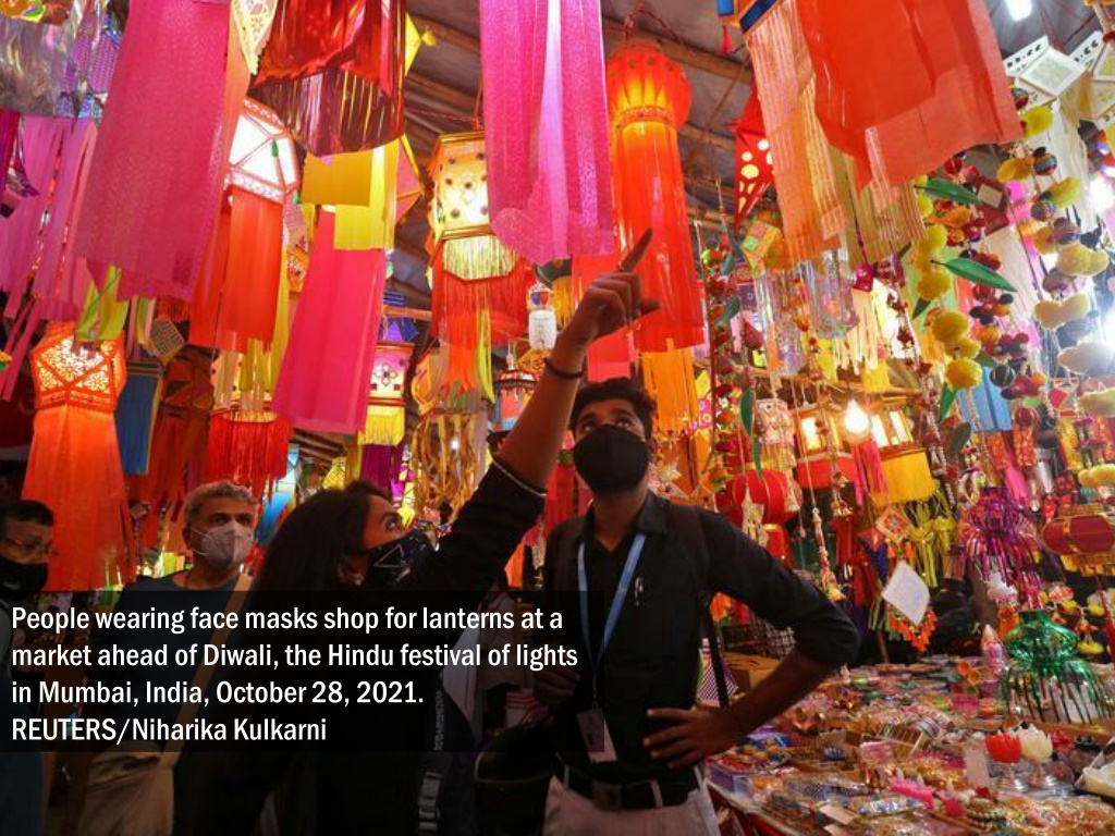 People wearing face masks shop for lanterns at a market ahead of Diwali, the Hindu festival of lights in Mumbai, India, October 28, 2021. REUTERS/Niharika Kulkarni