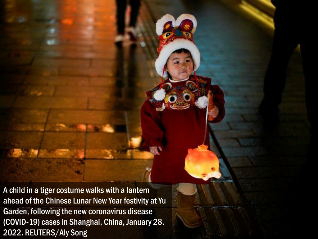 A child in a tiger costume walks with a lantern ahead of the Chinese Lunar New Year festivity at Yu Garden, following the new coronavirus disease (COVID-19) cases in Shanghai, China, January 28, 2022. REUTERS/Aly Song
