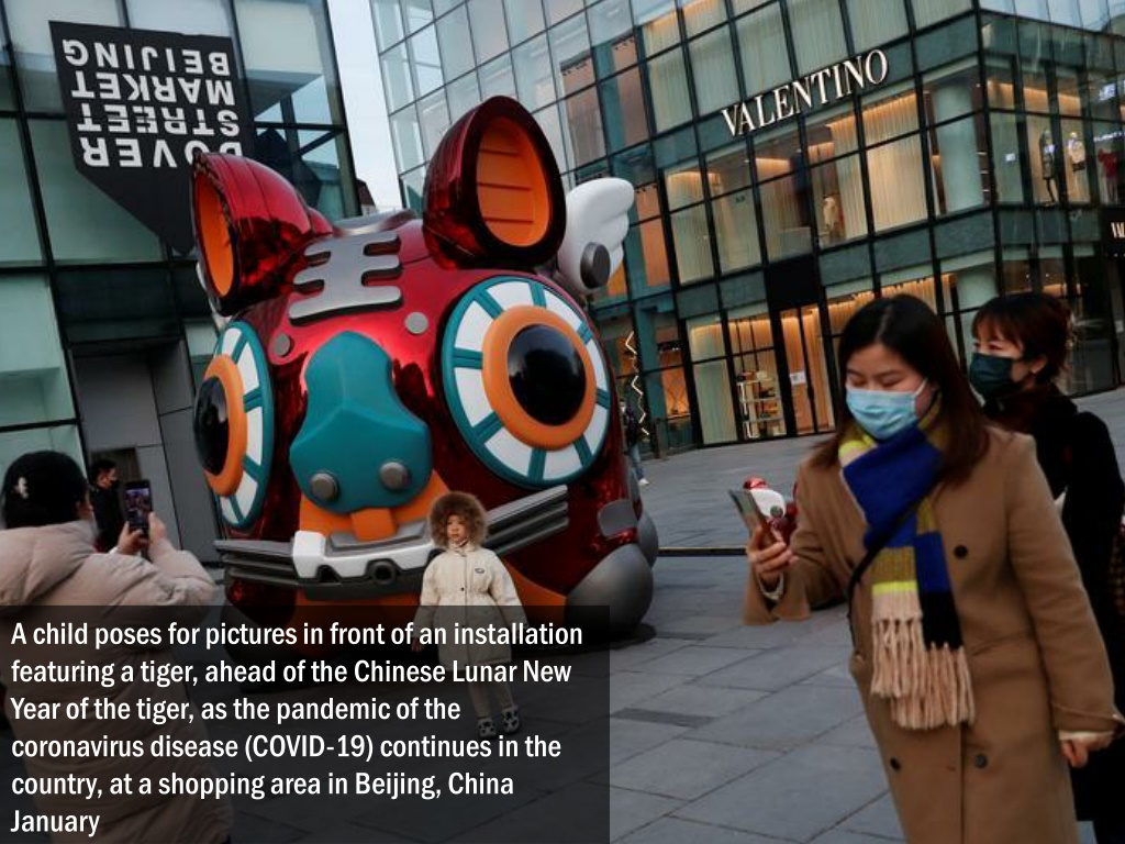 A child poses for pictures in front of an installation featuring a tiger, ahead of the Chinese Lunar New Year of the tiger, as the pandemic of the coronavirus disease (COVID-19) continues in the country, at a shopping area in Beijing, China January