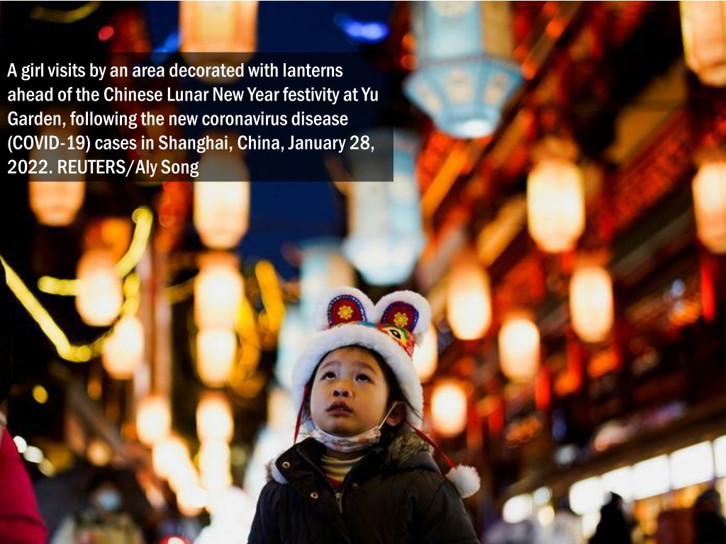 A girl visits by an area decorated with lanterns ahead of the Chinese Lunar New Year festivity at Yu Garden, following the new coronavirus disease (COVID-19) cases in Shanghai, China, January 28, 2022. REUTERS/Aly Song
