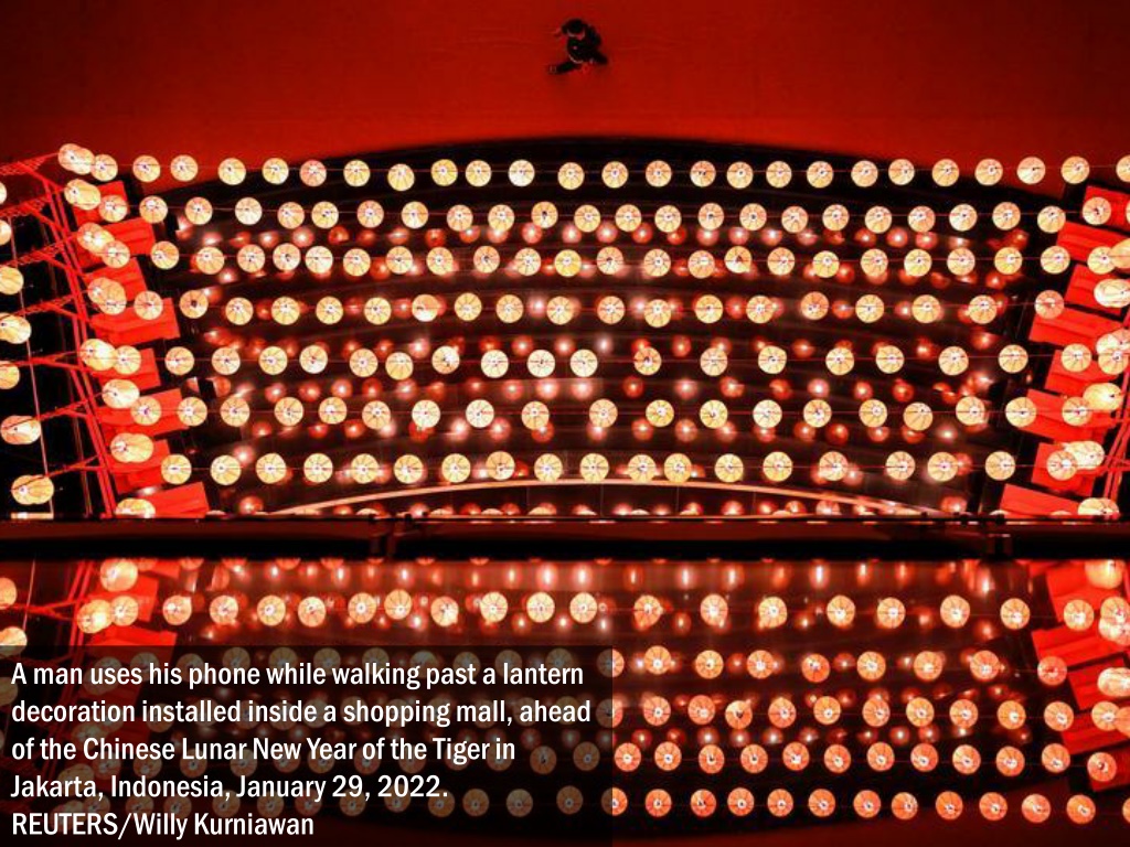 A man uses his phone while walking past a lantern decoration installed inside a shopping mall, ahead of the Chinese Lunar New Year of the Tiger in Jakarta, Indonesia, January 29, 2022. REUTERS/Willy Kurniawan