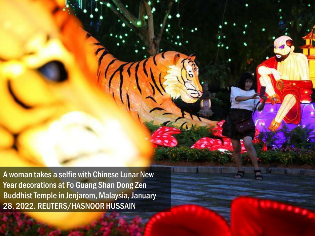 A woman takes a selfie with Chinese Lunar New Year decorations at Fo Guang Shan Dong Zen Buddhist Temple in Jenjarom, Malaysia, January 28, 2022. REUTERS/HASNOOR HUSSAIN