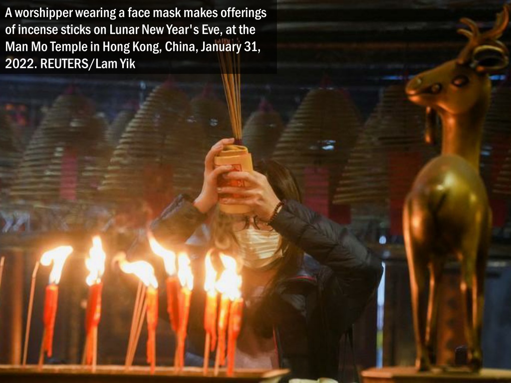 A worshipper wearing a face mask makes offerings of incense sticks on Lunar New Year's Eve, at the Man Mo Temple in Hong Kong, China, January 31, 2022. REUTERS/Lam Yik