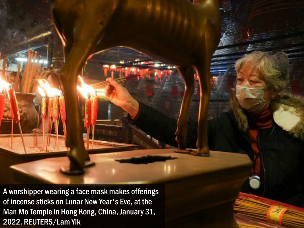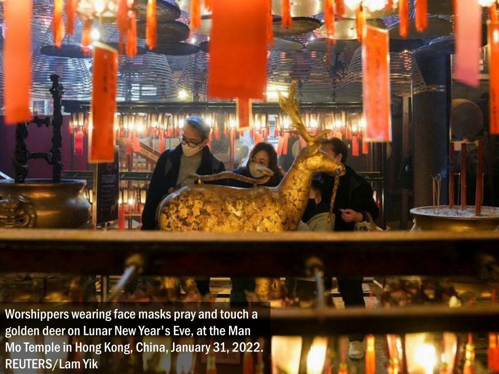 Worshippers wearing face masks pray and touch a golden deer on Lunar New Year's Eve, at the Man Mo Temple in Hong Kong, China, January 31, 2022. REUTERS/Lam Yik