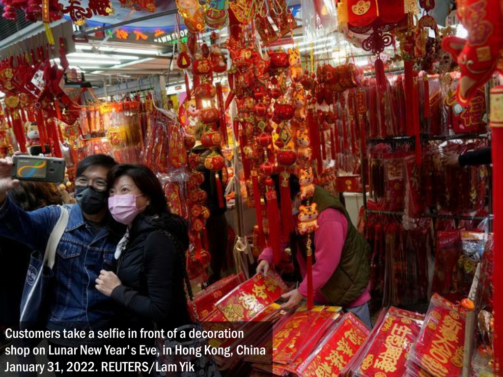 Customers take a selfie in front of a decoration shop on Lunar New Year's Eve, in Hong Kong, China January 31, 2022. REUTERS/Lam Yik