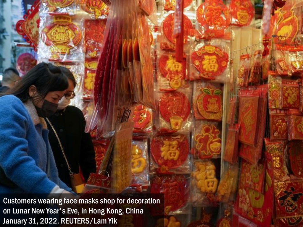 Customers wearing face masks shop for decoration on Lunar New Year's Eve, in Hong Kong, China January 31, 2022. REUTERS/Lam Yik
