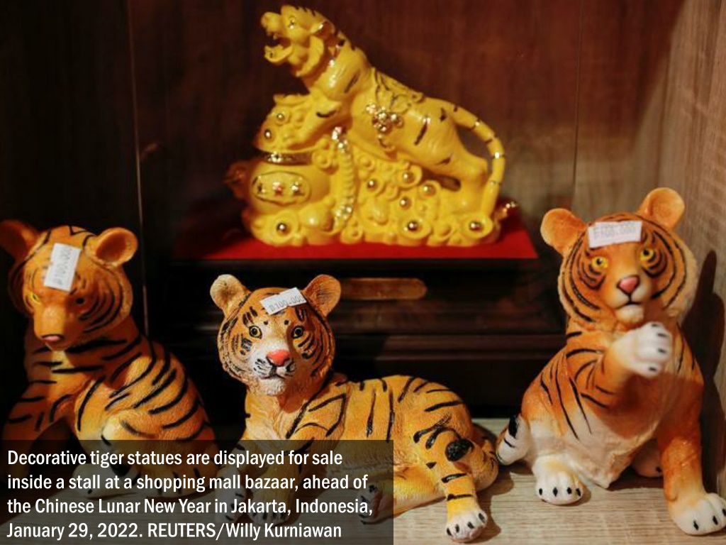 Decorative tiger statues are displayed for sale inside a stall at a shopping mall bazaar, ahead of the Chinese Lunar New Year in Jakarta, Indonesia, January 29, 2022. REUTERS/Willy Kurniawan
