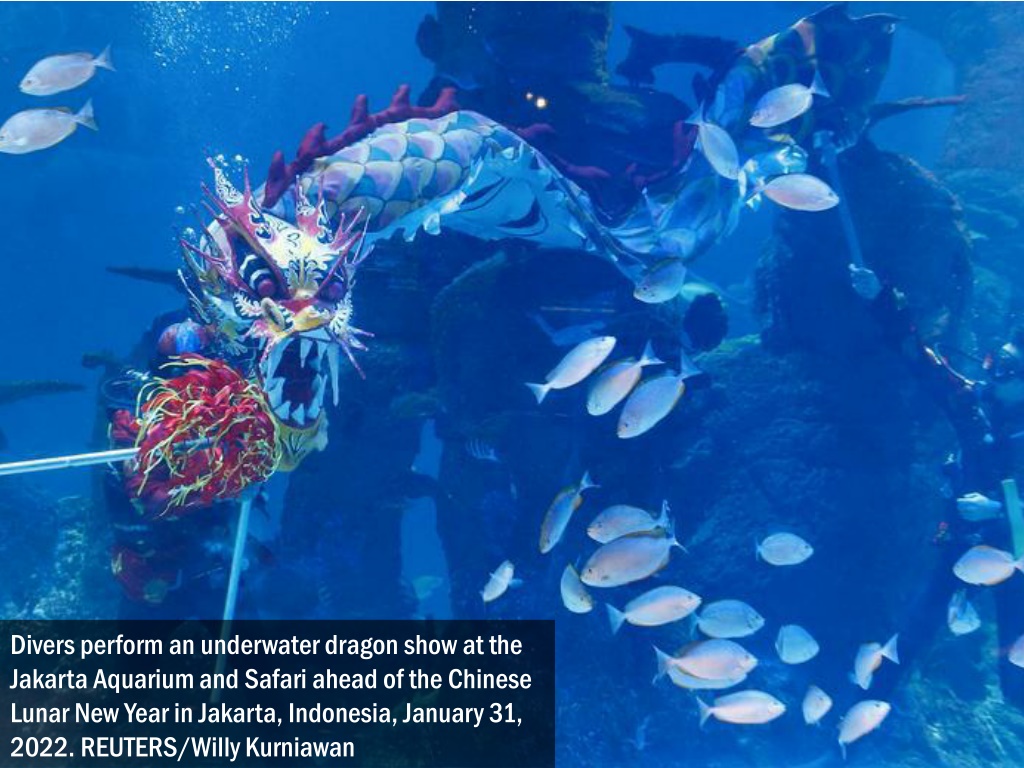 Divers perform an underwater dragon show at the Jakarta Aquarium and Safari ahead of the Chinese Lunar New Year in Jakarta, Indonesia, January 31, 2022. REUTERS/Willy Kurniawan