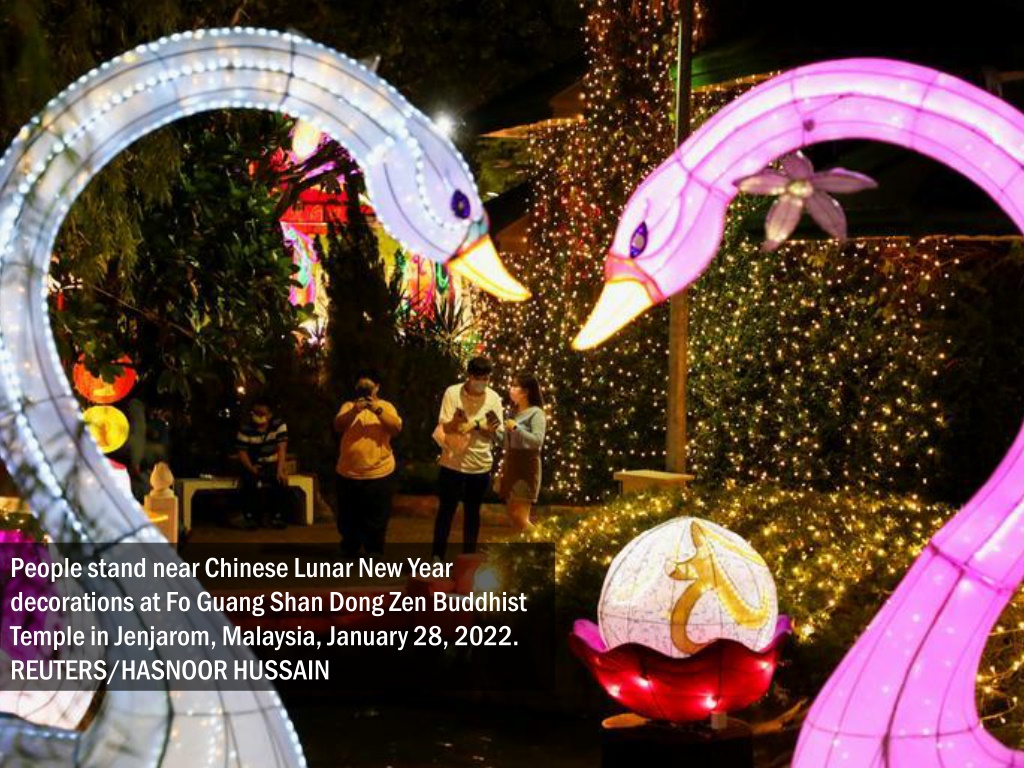 People stand near Chinese Lunar New Year decorations at Fo Guang Shan Dong Zen Buddhist Temple in Jenjarom, Malaysia, January 28, 2022. REUTERS/HASNOOR HUSSAIN
