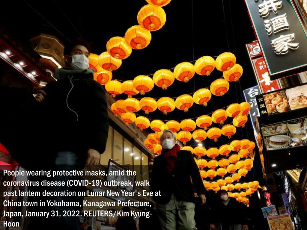 People wearing protective masks, amid the coronavirus disease (COVID-19) outbreak, walk past lantern decoration on Lunar New Year's Eve at China town in Yokohama, Kanagawa Prefecture, Japan, January 31, 2022. REUTERS/Kim Kyung-Hoon