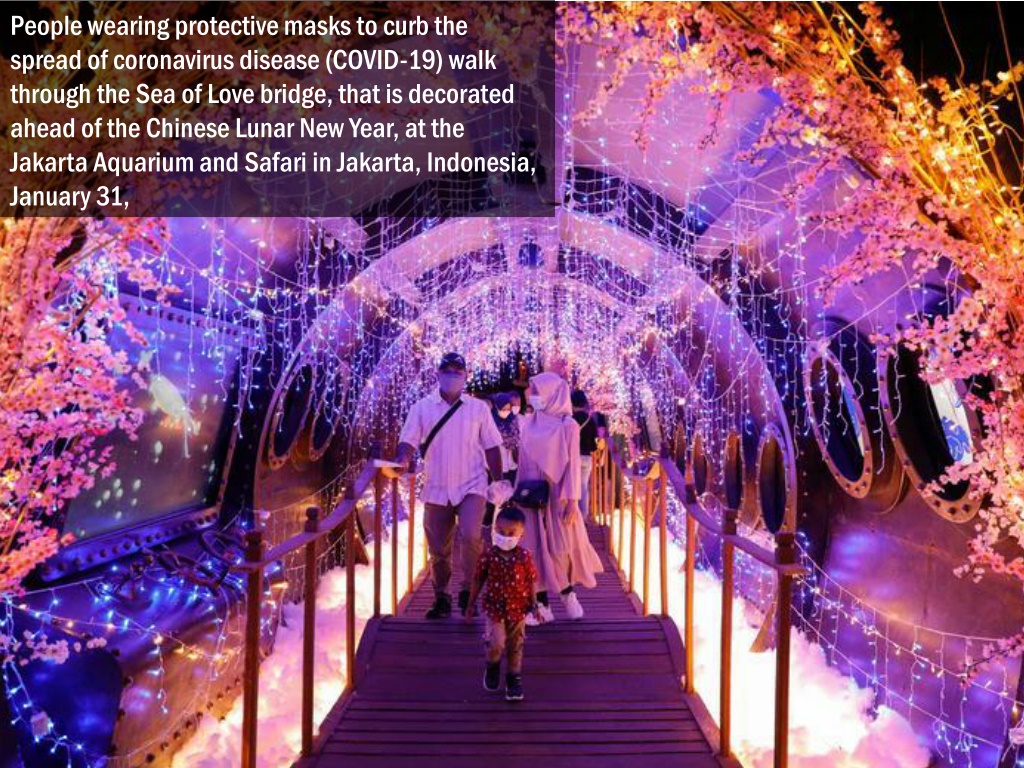 People wearing protective masks to curb the spread of coronavirus disease (COVID-19) walk through the Sea of Love bridge, that is decorated ahead of the Chinese Lunar New Year, at the Jakarta Aquarium and Safari in Jakarta, Indonesia, January 31,
