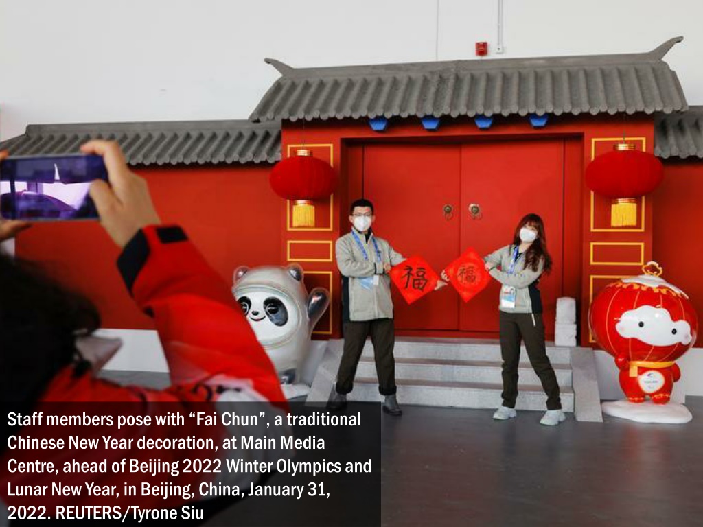 Staff members pose with “Fai Chun”, a traditional Chinese New Year decoration, at Main Media Centre, ahead of Beijing 2022 Winter Olympics and Lunar New Year, in Beijing, China, January 31, 2022. REUTERS/Tyrone Siu