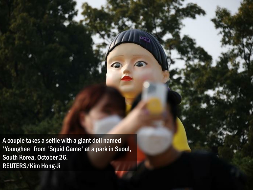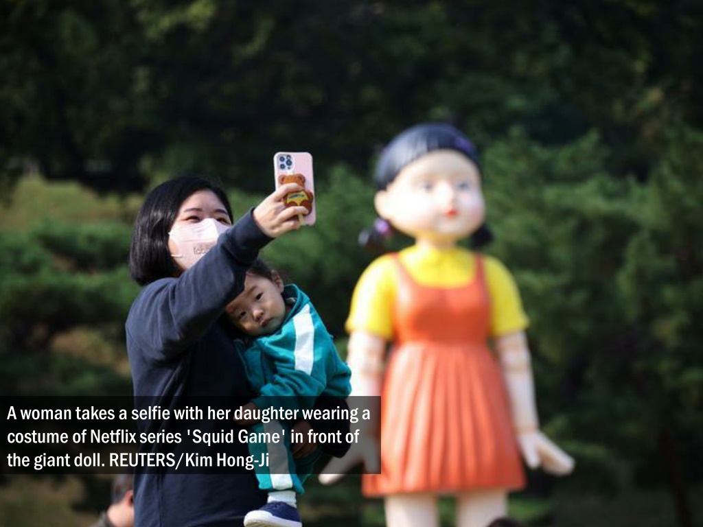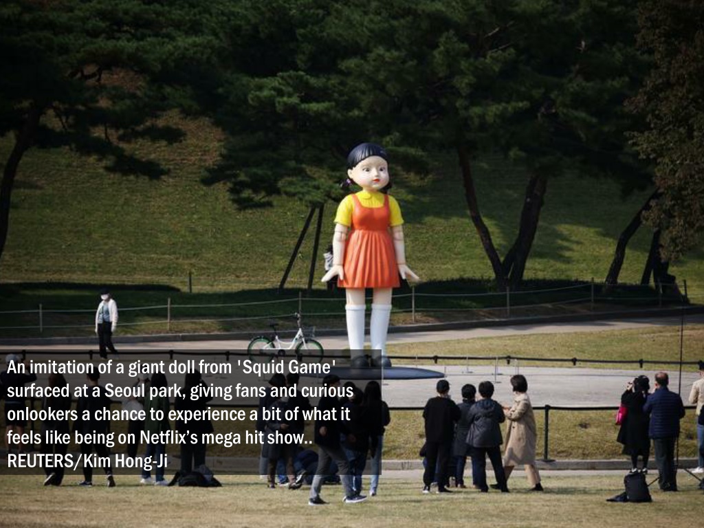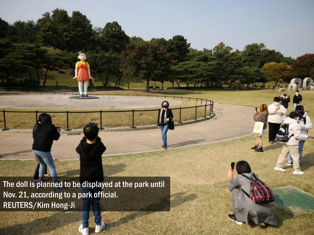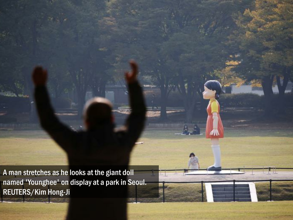 An imitation of a giant doll from 'Squid Game' surfaced at a Seoul park, giving fans and curious onlookers a chance to experience a bit of what it feels like being on Netflix’s mega hit show.. REUTERS/Kim Hong-Ji